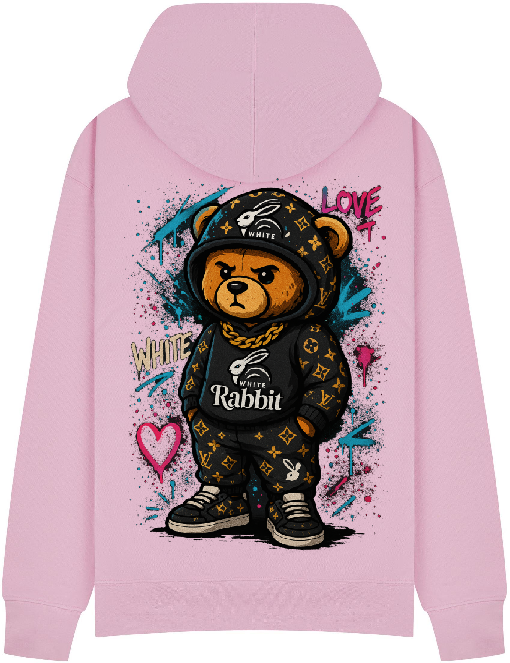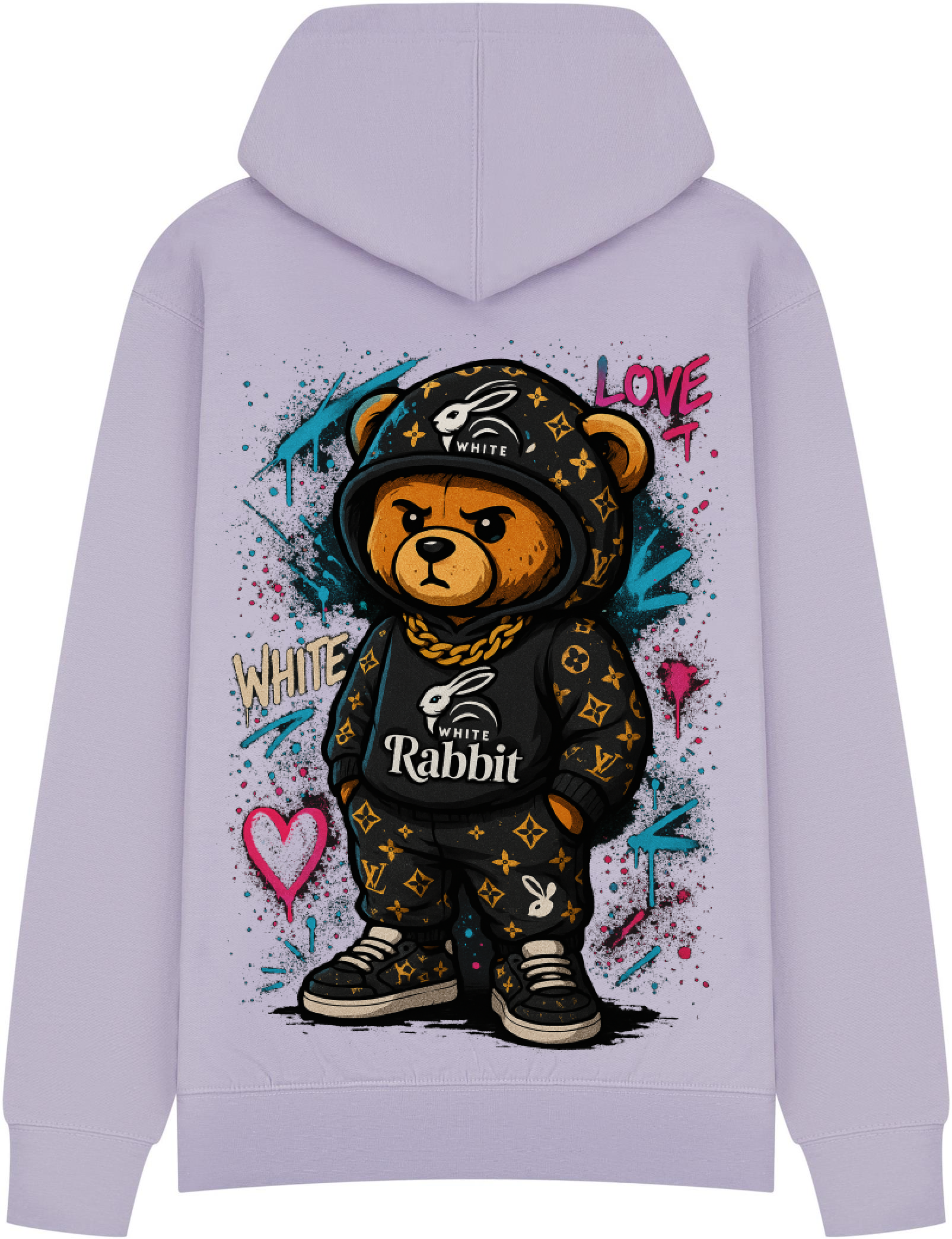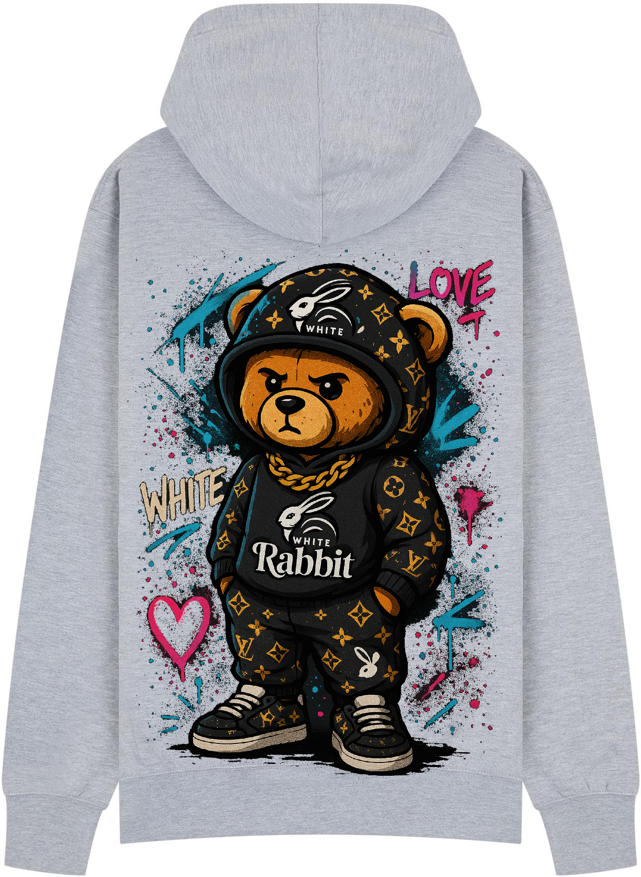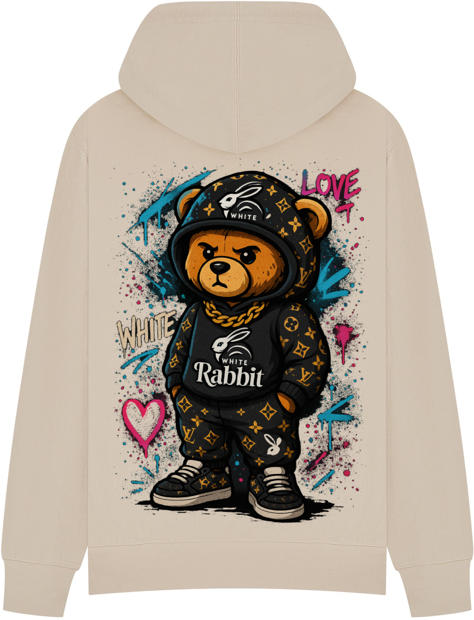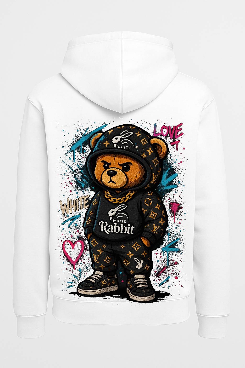 Level up your streetwear game with this bold, graphic-White Rabbit hoodie. Featuring an exclusive graffiti-style teddy bear print on the back, the design oozes attitude and originality. Dressed head-to-toe in custom “White Rabbit” drip and surrounded by neon sprays, hearts, and street tags, this bear means business.