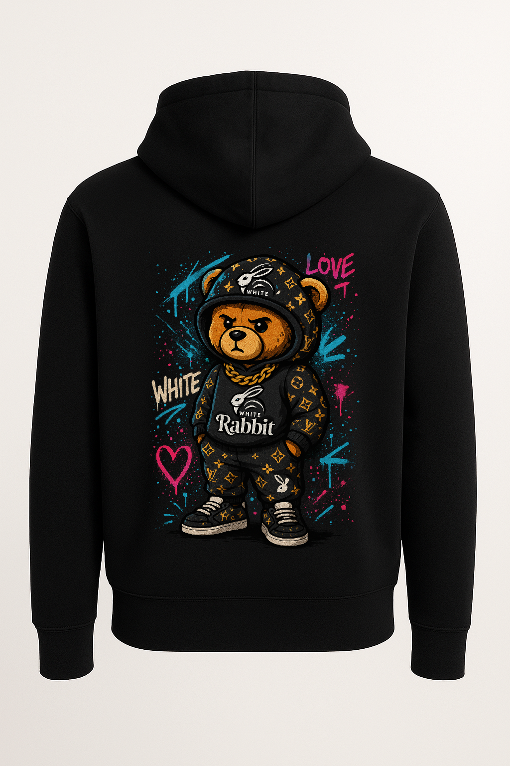 White Rabbit Graffiti Bear Hoodie – Statement Streetwear Black