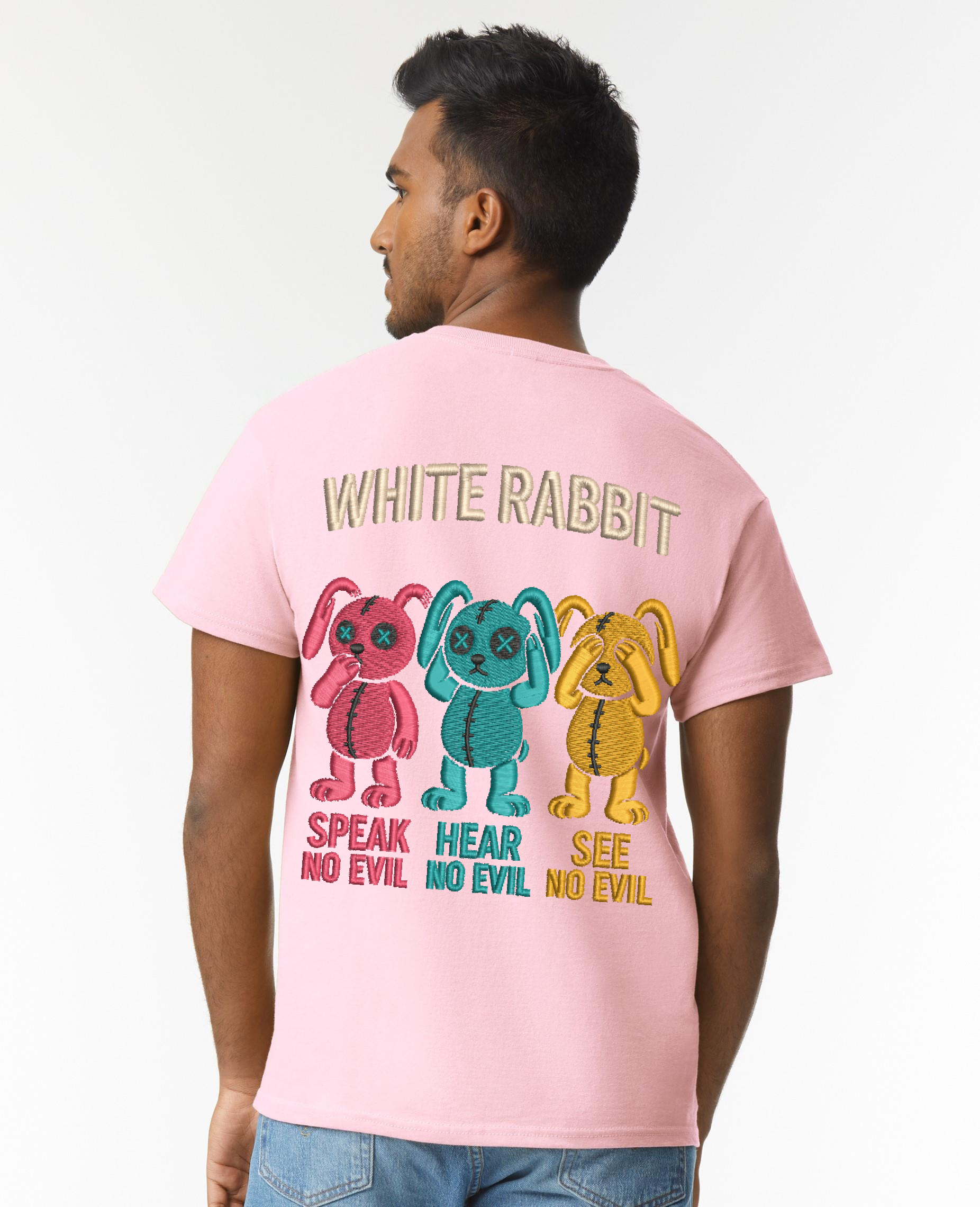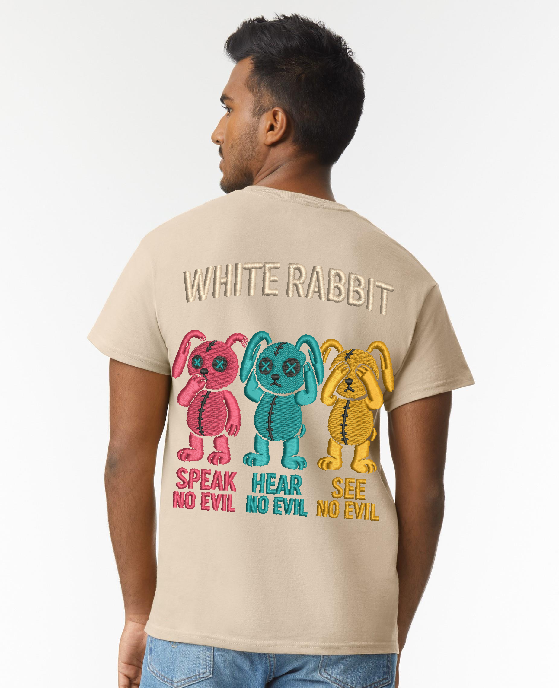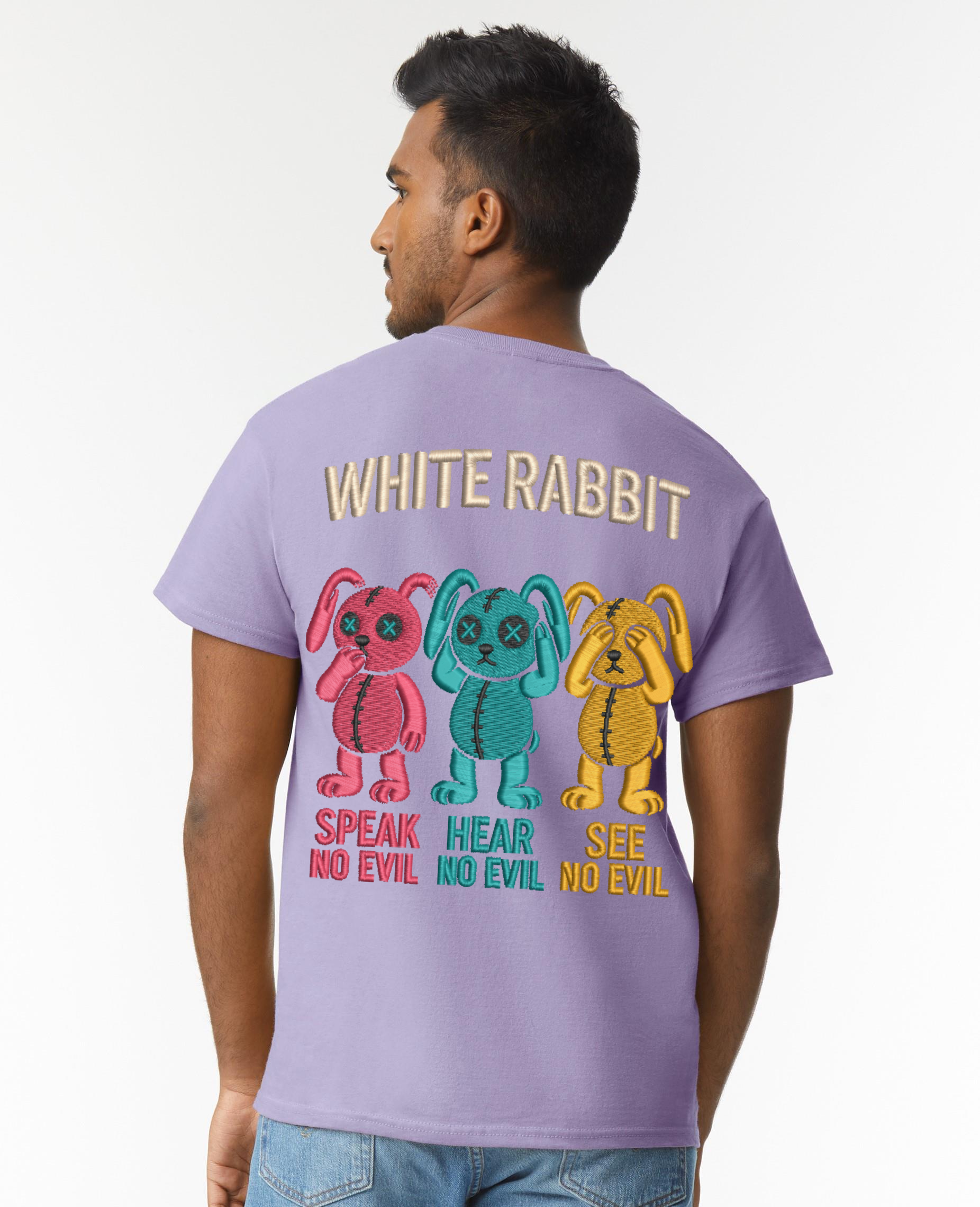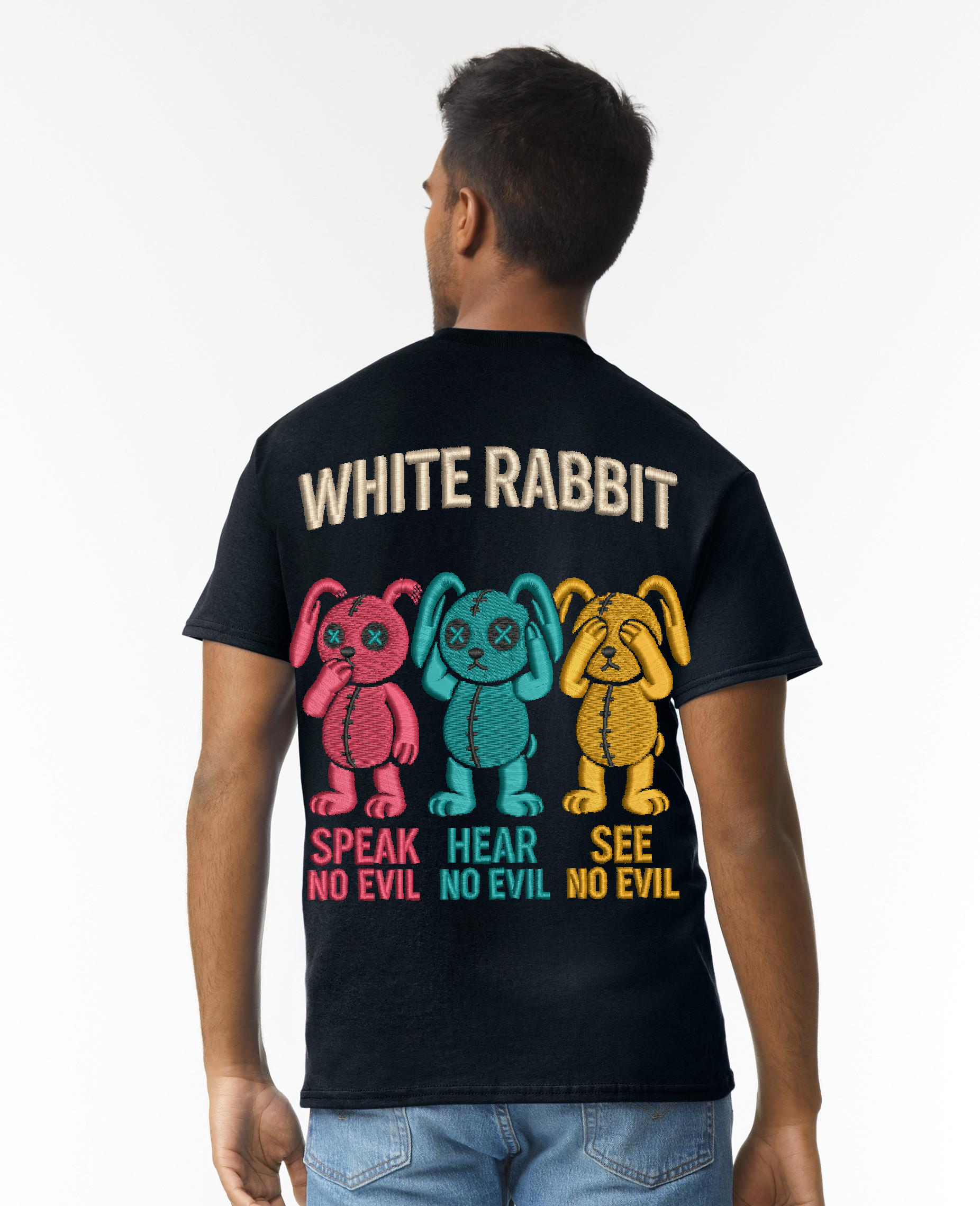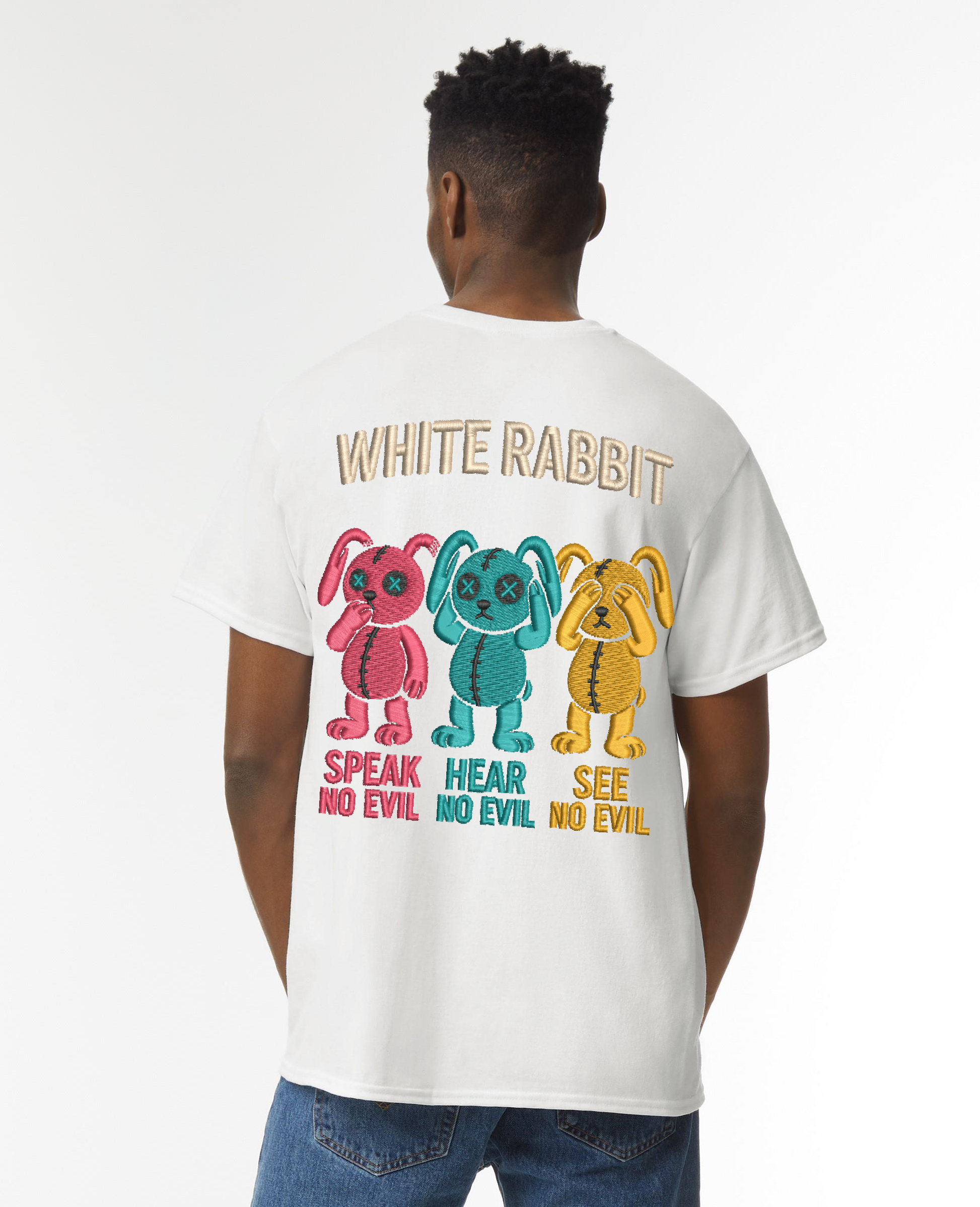 Turn heads with this bold streetwear statement. Featuring three stitched-style cartoon bunnies in vibrant colors, the “Speak No Evil, Hear No Evil, See No Evil” design captures rebellious energy with playful edge. Finished with the iconic WHITE RABBIT logo across the back, this tee is a must-have for those who wear attitude like armor. Made from premium cotton for comfort and style that lasts.
