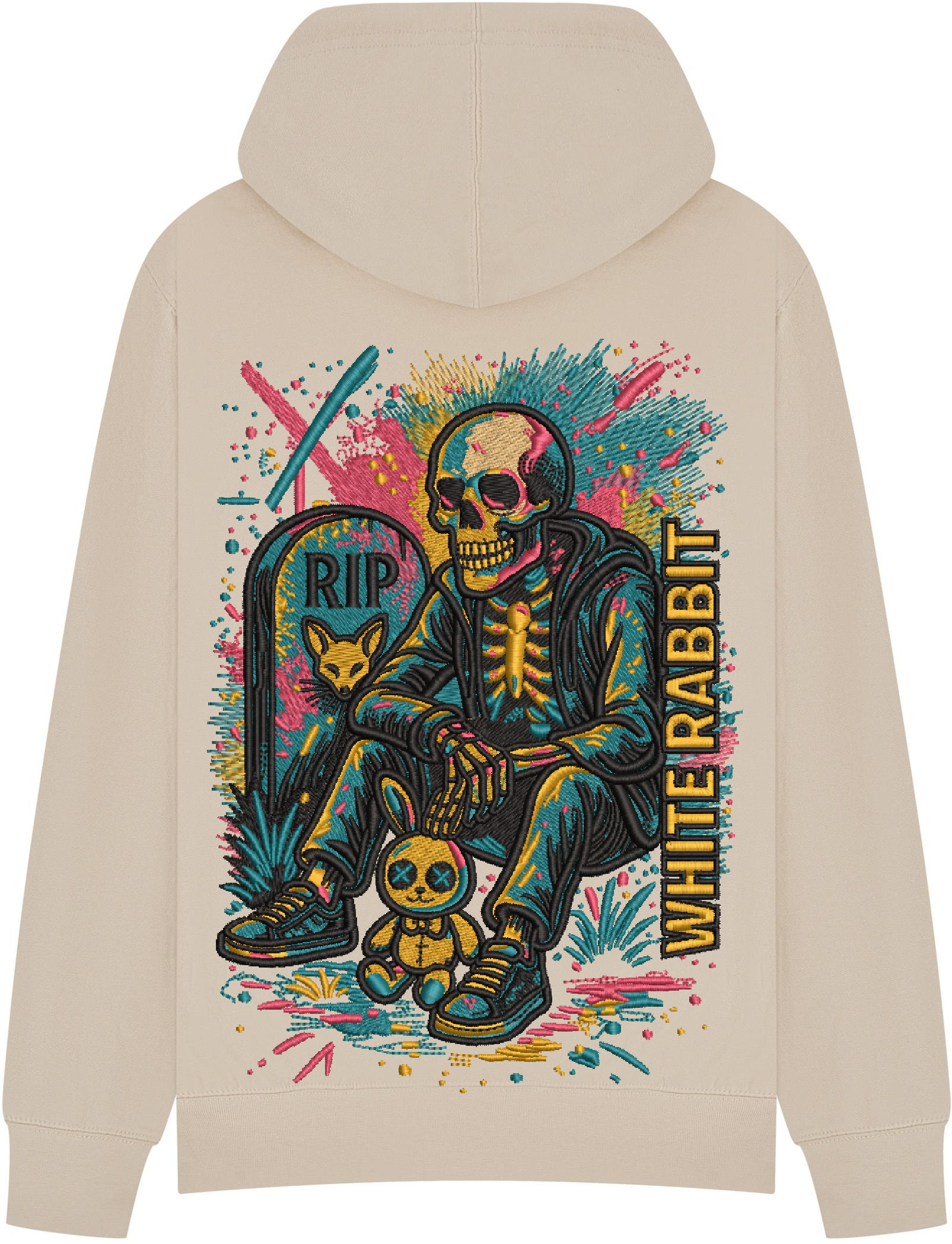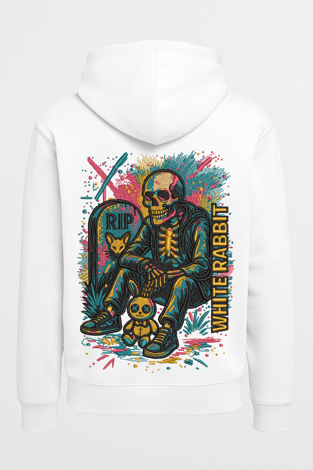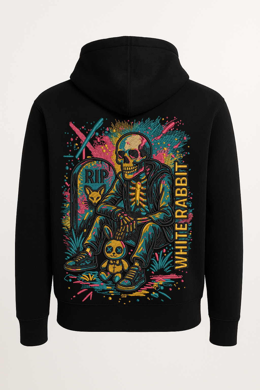 Dark, bold, and unmissable. The Restless Souls Hoodie from White Rabbit features a neon-charged skeleton chilling by a grave marked “RIP” — complete with a stitched bunny sidekick and a burst of graffiti-style colors. This design is streetwear storytelling at its rawest. Printed on premium heavyweight cotton for lasting comfort and style.