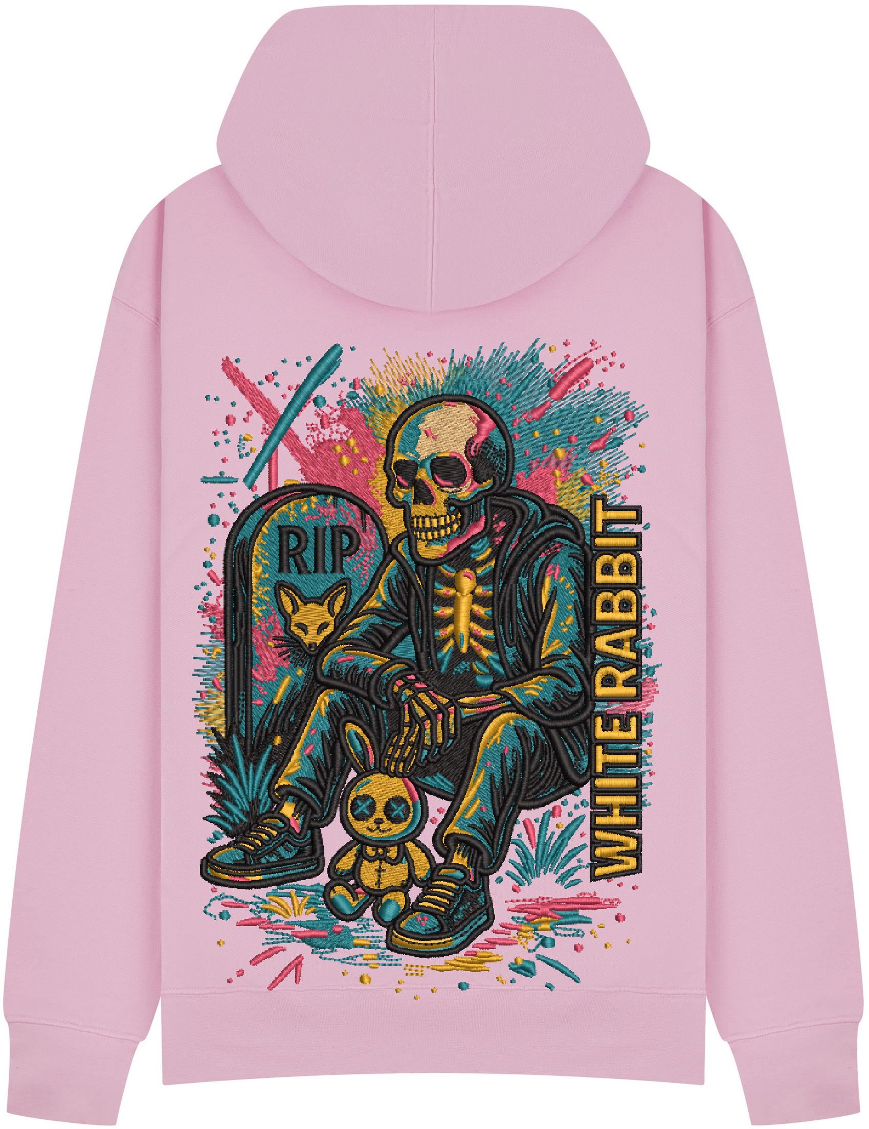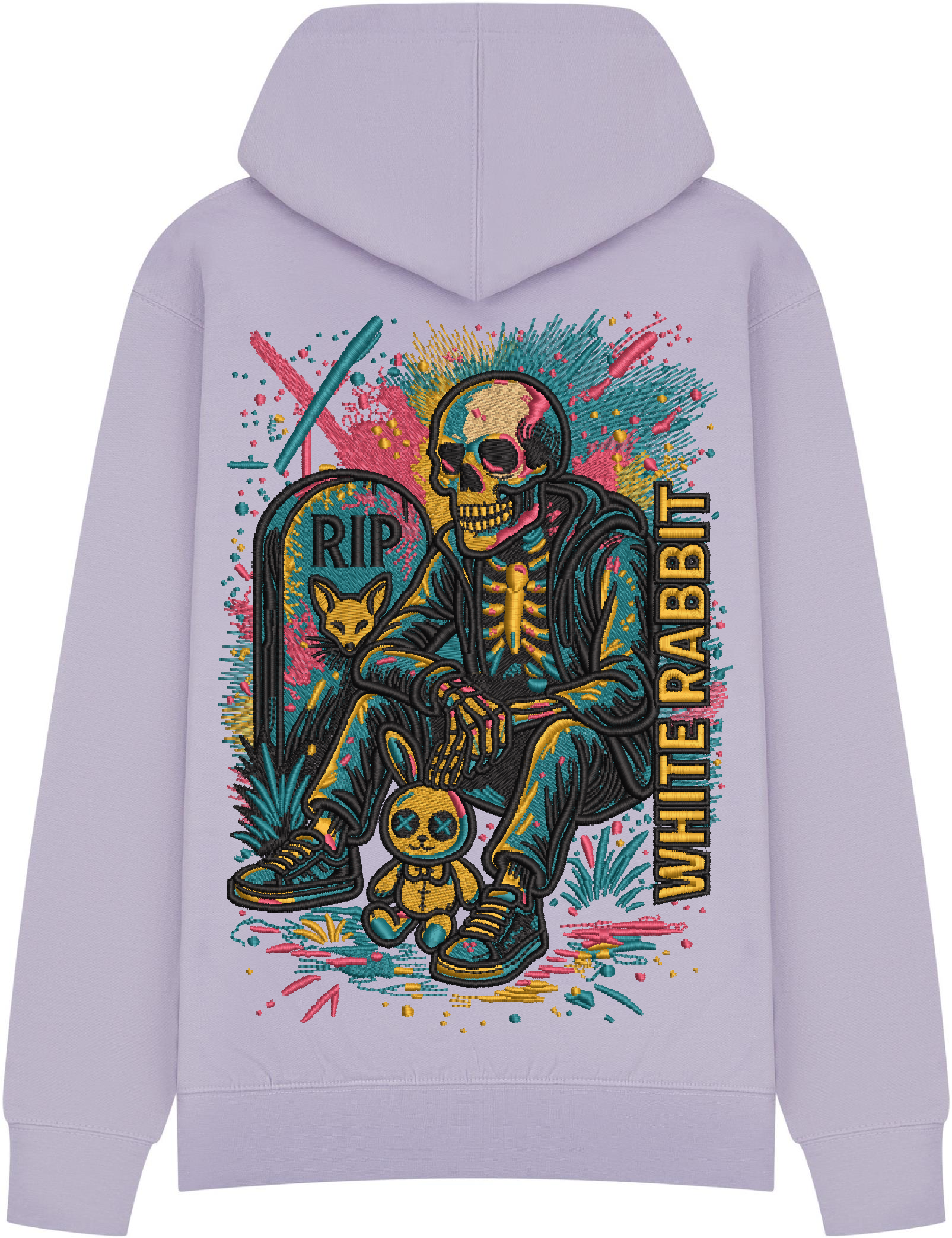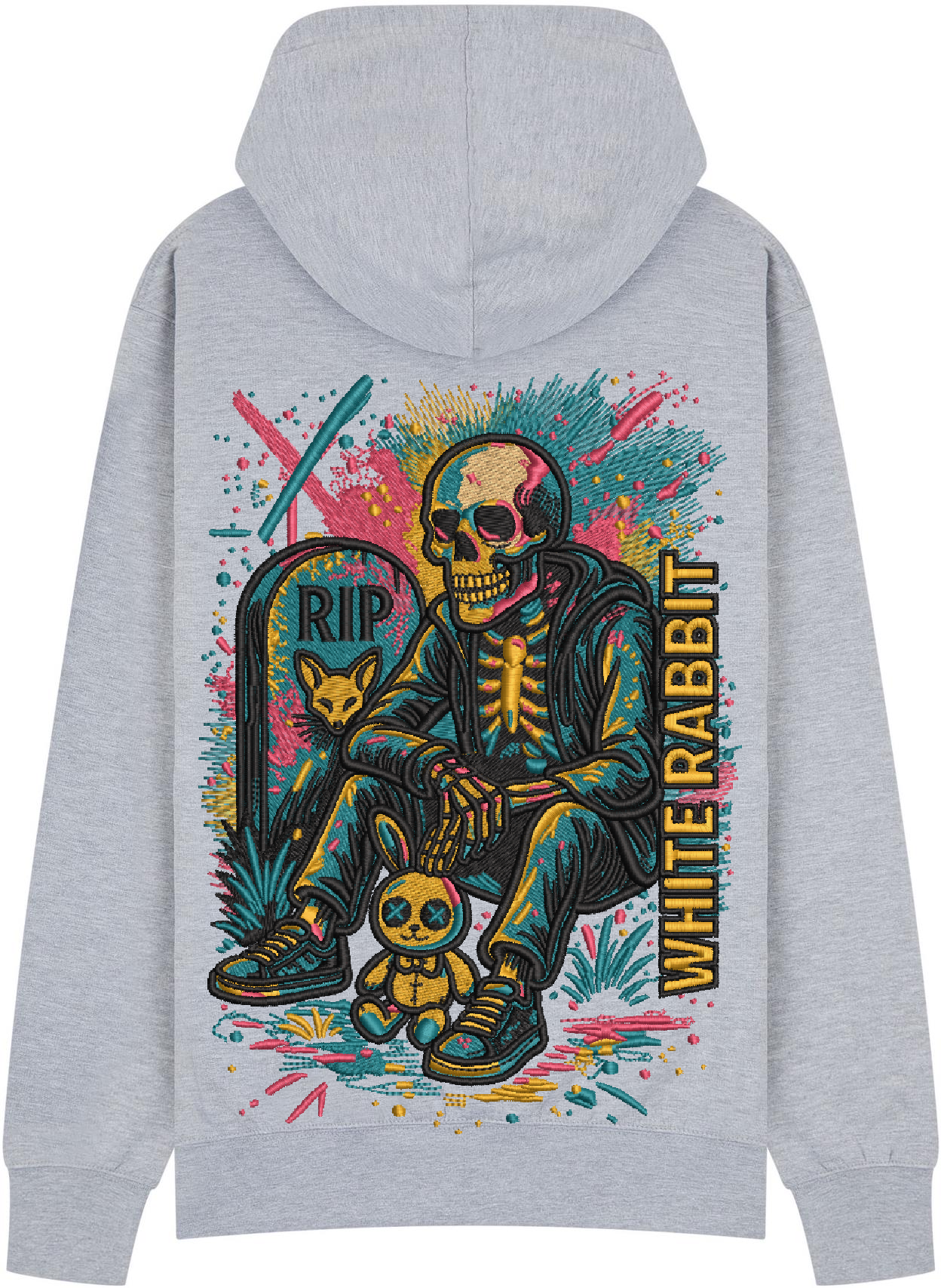 Dark, bold, and unmissable. The Restless Souls Hoodie from White Rabbit features a neon-charged skeleton chilling by a grave marked “RIP” — complete with a stitched bunny sidekick and a burst of graffiti-style colors. This design is streetwear storytelling at its rawest. Printed on premium heavyweight cotton for lasting comfort and style.
